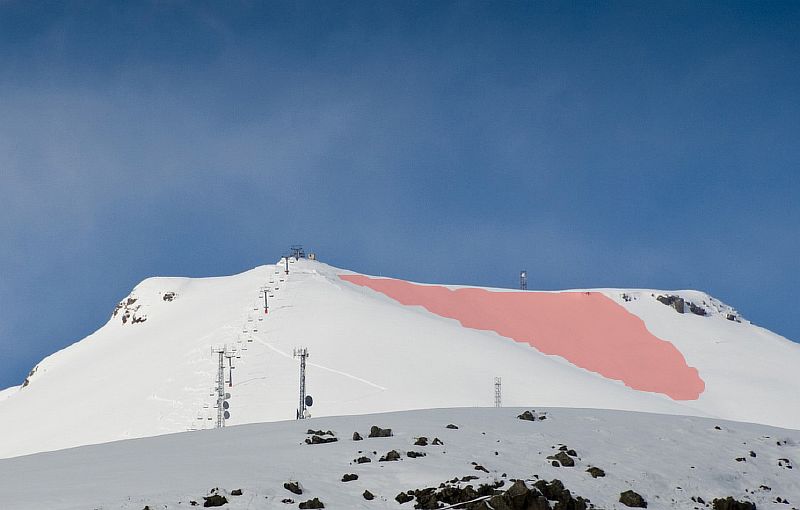 Данную часть горы многие райдеры проезжают траверсом для дальнейшего выката к нижней части канатной очереди, тем самым подрезая крутой склон и провоцируя возможный сход лавин.