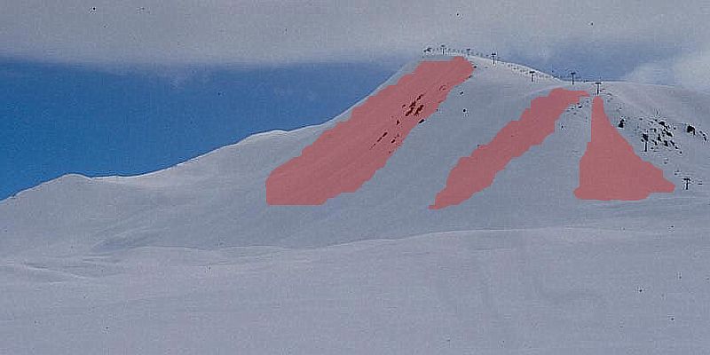 Практически все лавины, сходящие на курорте, образуются в одних и тех же лавинных очагах. Прежде всего, рассмотрим основные линии, где возникает повышенная лавинная ситуация. Это статистические данные. Обзор охватывает только часть, которая относится непосредственно к курорту.