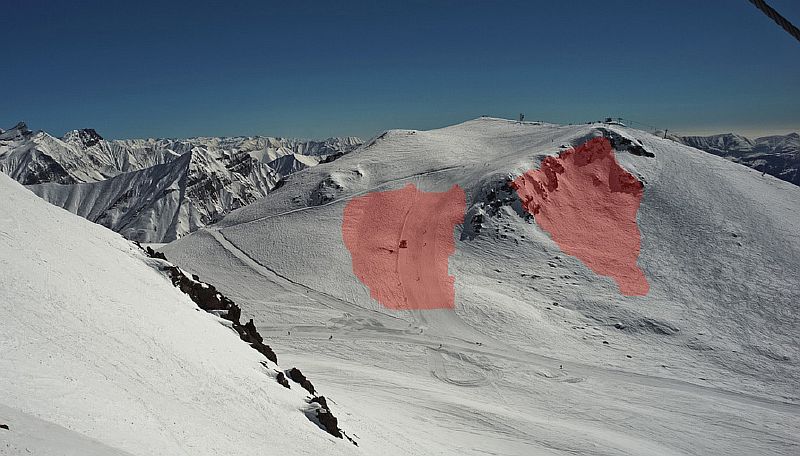 Первая – юго-восточная часть горы, чаша от креста до неявно выраженного гребня. Линия отрыва проходит в 20-30 метрах ниже вершинной площадки. Эта зона помечена специальным знаком лавинной опасности, однако большинство райдеров игнорирует его, траверсом подрезая нестабильный участок. Здесь лавины сходят не регулярно, иногда выжидая целый сезон. Однако, при схождении, лавина попадает в узкий кулуар с каменными сбросами, выходящими в Ущелье Хада.